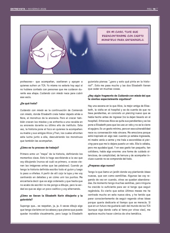 profesores%u2014 que acompa%u00f1an, sostienen y apoyan a quienes sufren un TCA. Yo misma no estar%u00eda hoy aqu%u00ed si no hubiera contado con personas que me cuidaron durante esa etapa. Cuidando con miedo nace para cubrir ese vac%u00edo.%u00bfDe qu%u00e9 trata?Cuidando con miedo es la continuaci%u00f3n de Comiendo con miedo, donde Elisabeth cre%u00eda haber dejado atr%u00e1s a Nore, el monstruo de la anorexia. Pero al crecer tambi%u00e9n crecen los miedos y se enfrenta a una reca%u00edda en su anorexia durante su %u00faltimo a%u00f1o de instituto. Esta vez, la historia pone el foco en quienes la acompa%u00f1an: su madre y sus amigos Alice y Fran, los cuales afrontan esta lucha junto a ella, descubriendo los monstruos que tambi%u00e9n les acompa%u00f1an.%u00bfC%u00f3mo es tu proceso de trabajo?Primero armo un %u201cmapa%u201d de la historia, definiendo los momentos clave. Esto lo hago escribiendo a la vez que voy dibujando (nunca s%u00e9 cu%u00e1l va primero, a veces vienen las im%u00e1genes antes que las palabras). Cuando ya tengo la historia definida escribo todo el guion y luego lo paso a vi%u00f1etas. A partir de all%u00ed cojo la lupa y me voy centrando en detalles y en c%u00f3mo unir los puntos. Me encantar%u00eda decir que es algo ordenado y que hasta que no acabo de escribir no me pongo a dibujar, pero la verdad es que es algo un poco ca%u00f3tico y voy alternando.%u00bfC%u00f3mo se llevan la Elisabeth Karin dibujante y la guionista?Supongo que%u2026 se respetan, ja, ja. A veces dibujo algo que tengo clar%u00edsimo en la cabeza y que pienso que puede quedar incre%u00edble visualmente, pero luego la Elisabeth guionista piensa: %u201c%u00bfpero y esto qu%u00e9 pinta en la historia?%u201d. Esto me pasa mucho y las dos Elisabeth tienen que ceder en muchas cosas.%u00bfHay alg%u00fan fragmento de Cuidando con miedo del que te sientas especialmente orgullosa?Hay una escena en la que Alice, la mejor amiga de Elisabeth, la visita en el hospital y se da cuenta de que no lleva pendientes, en concreto un piercing nuevo que se hab%u00eda hecho antes de ingresar (no la dejan llevarlo en el hospital). Entonces Alice se quita sus pendientes y se los pone a Elisabeth para que los use un rato y no se le cierre el agujero. Es un gesto m%u00ednimo, pero en esa vulnerabilidad nace su conversaci%u00f3n m%u00e1s sincera. Me emociona porque est%u00e1 inspirado en algo real: cuando yo estaba ingresada, mi madre ven%u00eda a verme y me tra%u00eda a escondidas el piercing para que me lo dejara puesto un rato. Ella lo odiaba, pero me ayudaba igual. Y en ese gesto tan peque%u00f1o, tan cotidiano, hab%u00eda algo enorme: una forma de cuidado silenciosa, de complicidad, de ternura y de acompa%u00f1ar incluso cuando no se comprende del todo.%u00bfPreparas algo nuevo?Tengo lo que llamo un jard%u00edn donde voy plantando ideas nuevas, que son como semillitas. Algunas las voy regando de vez en cuando, otras se quedan abandonadas. De momento tengo muchas semillas, pero ninguna ha crecido lo suficiente para ver si tengo que seguir reg%u00e1ndola. Es cierto que estos %u00faltimos meses me he centrado mucho en esta nueva obra, y he tenido que parar conscientemente de seguir regando otras ideas porque quer%u00eda dedicarle el tiempo que se merec%u00eda. S%u00ed que en un futuro me gustar%u00eda salir del mundo de los TCA (aunque siga dando ca%u00f1a al tema por otras v%u00edas), me apetece mucho hacer c%u00f3mics de otra tem%u00e1tica.ENTREVISTA %u2022 INVIERNO 2026 P%u00c1G. 14 //