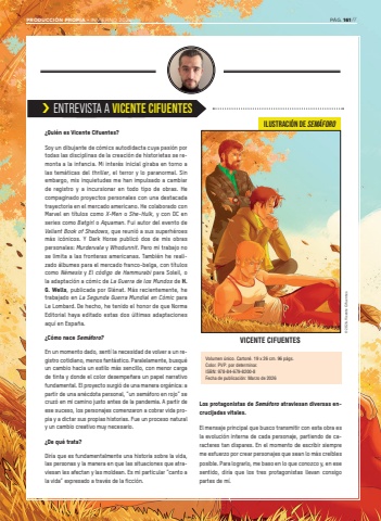 %u00bfQui%u00e9n es Vicente Cifuentes?Soy un dibujante de c%u00f3mics autodidacta cuya pasi%u00f3n por todas las disciplinas de la creaci%u00f3n de historietas se remonta a la infancia. Mi inter%u00e9s inicial giraba en torno a las tem%u00e1ticas del thriller, el terror y lo paranormal. Sin embargo, mis inquietudes me han impulsado a cambiar de registro y a incursionar en todo tipo de obras. He compaginado proyectos personales con una destacada trayectoria en el mercado americano. He colaborado con Marvel en t%u00edtulos como X-Men o She-Hulk, y con DC en series como Batgirl o Aquaman. Fui autor del evento de Valiant Book of Shadows, que reuni%u00f3 a sus superh%u00e9roes m%u00e1s ic%u00f3nicos. Y Dark Horse public%u00f3 dos de mis obras personales: Murdervale y Whodunnit. Pero mi trabajo no se limita a las fronteras americanas. Tambi%u00e9n he realizado %u00e1lbumes para el mercado franco-belga, con t%u00edtulos como N%u00e9mesis y El c%u00f3digo de Hammurabi para Soleil, o la adaptaci%u00f3n a c%u00f3mic de La Guerra de los Mundos de H. G. Wells, publicada por Gl%u00e9nat. M%u00e1s recientemente, he trabajado en La Segunda Guerra Mundial en C%u00f3mic para Le Lombard. De hecho, he tenido el honor de que Norma Editorial haya editado estas dos %u00faltimas adaptaciones aqu%u00ed en Espa%u00f1a.%u00bfC%u00f3mo nace Sem%u00e1foro?En un momento dado, sent%u00ed la necesidad de volver a un registro cotidiano, menos fant%u00e1stico. Paralelamente, busqu%u00e9 un cambio hacia un estilo m%u00e1s sencillo, con menor carga de tinta y donde el color desempe%u00f1ara un papel narrativo fundamental. El proyecto surgi%u00f3 de una manera org%u00e1nica: a partir de una an%u00e9cdota personal, %u201cun sem%u00e1foro en rojo%u201d se cruz%u00f3 en mi camino justo antes de la pandemia. A partir de ese suceso, los personajes comenzaron a cobrar vida propia y a dictar sus propias historias. Fue un proceso natural y un cambio creativo muy necesario.%u00bfDe qu%u00e9 trata?Dir%u00eda que es fundamentalmente una historia sobre la vida, las personas y la manera en que las situaciones que atraviesan les afectan y las moldean. Es mi particular %u201ccanto a la vida%u201d expresado a trav%u00e9s de la ficci%u00f3n.Los protagonistas de Sem%u00e1foro atraviesan diversas encrucijadas vitales.El mensaje principal que busco transmitir con esta obra es la evoluci%u00f3n interna de cada personaje, partiendo de caracteres tan dispares. En el momento de escribir siempre me esfuerzo por crear personajes que sean lo m%u00e1s cre%u00edbles posible. Para lograrlo, me baso en lo que conozco y, en ese sentido, dir%u00eda que los tres protagonistas llevan consigo partes de m%u00ed.%u203a ENTREVISTA A VICENTE CIFUENTES%u00a9 2026, Vicente CifuentesVICENTE CIFUENTESVolumen %u00fanico. Carton%u00e9. 19 x 26 cm. 96 p%u00e1gs. Color. PVP: por determinar. ISBN: 978-84-679-8200-8Fecha de publicaci%u00f3n: Marzo de 2026ILUSTRACI%u00d3N DE SEM%u00c1FOROPRODUCCI%u00d3N PROPIA %u2022 INVIERNO 2026 P%u00c1G. 161 //