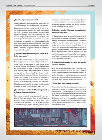 %u00bfC%u00f3mo fue el proceso de creaci%u00f3n?Como ya mencion%u00e9, todo empez%u00f3 con la an%u00e9cdota del %u201csem%u00e1foro en rojo%u201d. Reflexion%u00e9 sobre lo que significaba esa pausa, ese rojo, y me di cuenta de que no ten%u00eda por qu%u00e9 ser algo negativo. Esa fue la premisa que dio inicio a este viaje. A partir de ah%u00ed, los personajes empezaron a surgir. Ten%u00eda claro que quer%u00eda que fueran tres amigos, como los colores del sem%u00e1foro, pero que en lugar de representar un color cada uno, todos tuvieran que atravesar los tres colores. La parte m%u00e1s larga del proceso fue la construcci%u00f3n del guion, que fui haciendo mientras lo compaginaba con otros trabajos. A diferencia del guion, el dibujo es, para m%u00ed, lo m%u00e1s sencillo de realizar.%u00bfCambia mucho trabajar sobre guion propio en relaci%u00f3n a uno ajeno?Totalmente. Cuando recibo un guion, mi primer instinto es ponerme en la mente del guionista e intentar captar lo que espera en cada vi%u00f1eta. Tengo la suerte de que, %u00faltimamente, mis colaboradores me env%u00edan relatos en lugar de guiones t%u00e9cnicos, lo cual prefiero porque me permite sentir la historia como propia y realizar mi %u201ccorte del director%u201d particular, dise%u00f1ando la composici%u00f3n y el ritmo narrativo. Cuando escribo para m%u00ed, el proceso es m%u00e1s sencillo: s%u00e9 exactamente lo que busco en cada p%u00e1gina. Cuando colaboro con un guionista, esa responsabilidad es compartida. Sin embargo, cuando trabajo en solitario, recae completamente sobre m%u00ed. %u00bfQu%u00e9 tal se llevan el Vicente Cifuentes guionista y el Vicente Cifuentes dibujante?Para bien o para mal, tengo que convivir con ambos. Es cierto que a veces el rol de guionista pone en alg%u00fan aprieto narrativo al dibujante, pero, como buen autodidacta en evoluci%u00f3n, recojo ese guante y lo solvento lo mejor posible. Adem%u00e1s, una vez que el c%u00f3mic est%u00e1 conceptualmente terminado, el dibujante siempre realiza mil y una revisiones de vi%u00f1etas o a%u00f1ade detalles para asegurar que la obra final luzca lo m%u00e1s pulida y atractiva posible.En Sem%u00e1foro abordas el tema del acompa%u00f1amiento a enfermos y ancianos.Yo trabaj%u00e9 con j%u00f3venes en un centro juvenil. Mi labor consist%u00eda en preparar actividades y transmitir un mensaje de compa%u00f1%u00eda y compa%u00f1erismo. Esta sensibilidad se acentu%u00f3 gracias a los testimonios de una amiga y una prima enfermera que trabajan en un centro para enfermos de Alzheimer y en la unidad de geriatr%u00eda, respectivamente. Creo que debemos tener mucha m%u00e1s conciencia social al respecto. Algo muy positivo de aquella experiencia no fue tanto lo que yo pude hacer u ofrecer, sino lo que recib%u00ed a cambio. Fue profundamente enriquecedor.El aislamiento y la soledad son otros dos grandes temas de Sem%u00e1foro.No lo podr%u00eda haber expresado mejor. Como mencion%u00e9 antes, este c%u00f3mic es mi canto a la vida. Y, para m%u00ed, la vida trata fundamentalmente de estar rodeado de gente. Creo que, en los tiempos que corren, donde parece que las circunstancias nos separan, yo prefiero alzar la voz por todo aquello que nos une.%u00bfTienes alg%u00fan proyecto en preparaci%u00f3n?Ahora mismo estoy terminando de pulir un nuevo proyecto que he escrito yo tambi%u00e9n, titulado El brillo de las mariposas. En esta ocasi%u00f3n, un grupo de chicas (y en particular una protagonista muy so%u00f1adora) llevan todo el peso narrativo. Aunque pensaba que me dedicar%u00eda a terminar un c%u00f3mic de terror que tengo a medias, esta nueva historia lleg%u00f3 de repente y sent%u00ed que ten%u00eda que contarla. Ojal%u00e1 y pronto tenga su oportunidad de ser le%u00edda.PRODUCCI%u00d3N PROPIA %u2022 INVIERNO 2026 P%u00c1G. 162 //