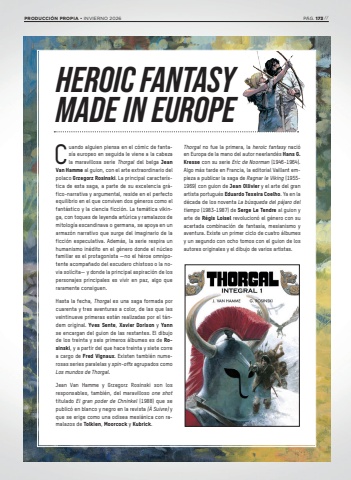 Cuando alguien piensa en el c%u00f3mic de fantas%u00eda europeo en seguida le viene a la cabeza la maravillosa serie Thorgal del belga Jean Van Hamme al guion, con el arte extraordinario del polaco Grzegorz Rosinski. La principal caracter%u00edstica de esta saga, a parte de su excelencia gr%u00e1fico-narrativa y argumental, reside en el perfecto equilibrio en el que conviven dos g%u00e9neros como el fant%u00e1stico y la ciencia ficci%u00f3n. La tem%u00e1tica vikinga, con toques de leyenda art%u00farica y ramalazos de mitolog%u00eda escandinava o germana, se apoya en un armaz%u00f3n narrativo que surge del imaginario de la ficci%u00f3n especulativa. Adem%u00e1s, la serie respira un humanismo in%u00e9dito en el g%u00e9nero donde el n%u00facleo familiar es el protagonista %u2014no el h%u00e9roe omnipotente acompa%u00f1ado del escudero chistoso o la novia sol%u00edcita%u2014 y donde la principal aspiraci%u00f3n de los personajes principales es vivir en paz, algo que raramente consiguen.Hasta la fecha, Thorgal es una saga formada por cuarenta y tres aventuras a color, de las que las veintinueve primeras est%u00e1n realizadas por el t%u00e1ndem original. Yves Sente, Xavier Dorison y Yannse encargan del guion de las restantes. El dibujo de los treinta y seis primeros %u00e1lbumes es de Rosinski, y a partir del que hace treinta y siete corre a cargo de Fred Vignaux. Existen tambi%u00e9n numerosas series paralelas y spin-offs agrupados como Los mundos de Thorgal.Jean Van Hamme y Grzegorz Rosinski son los responsables, tambi%u00e9n, del maravilloso one shot titulado El gran poder de Chninkel (1988) que se public%u00f3 en blanco y negro en la revista (%u00c0 Suivre) y que se erige como una odisea mesi%u00e1nica con ramalazos de Tolkien, Moorcock y Kubrick.Thorgal no fue la primera, la heroic fantasy naci%u00f3 en Europa de la mano del autor neerland%u00e9s Hans G. Kresse con su serie Eric de Noorman (1946-1964). Algo m%u00e1s tarde en Francia, la editorial Vaillant empieza a publicar la saga de Ragnar le Viking (1955-1969) con guion de Jean Ollivier y el arte del gran artista portugu%u00e9s Eduardo Texeira Coelho. Ya en la d%u00e9cada de los noventa La b%u00fasqueda del p%u00e1jaro del tiempo (1983-1987) de Serge Le Tendre al guion y arte de R%u00e9gis Loisel revolucion%u00f3 el g%u00e9nero con su acertada combinaci%u00f3n de fantas%u00eda, mesianismo y aventura. Existe un primer ciclo de cuatro %u00e1lbumes y un segundo con ocho tomos con el guion de los autores originales y el dibujo de varios artistas. HEROIC FANTASY MADE IN EUROPEPRODUCCI%u00d3N PROPIA %u2022 INVIERNO 2026 P%u00c1G. 173 //