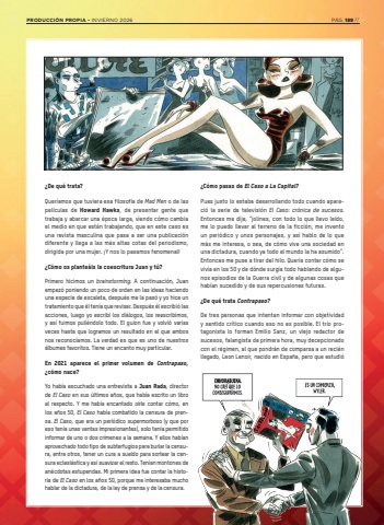 %u00bfDe qu%u00e9 trata?Quer%u00edamos que tuviera esa filosof%u00eda de Mad Men o de las pel%u00edculas de Howard Hawks, de presentar gente que trabaja y abarcar una %u00e9poca larga, viendo c%u00f3mo cambia el medio en que est%u00e1n trabajando, que en este caso es una revista masculina que pasa a ser una publicaci%u00f3n diferente y llega a las m%u00e1s altas cotas del periodismo, dirigida por una mujer. %u00a1Y nos lo pasamos fenomenal!%u00bfC%u00f3mo os plante%u00e1is la coescritura Juan y t%u00fa?Primero hicimos un brainstorming. A continuaci%u00f3n, Juan empez%u00f3 poniendo un poco de orden en las ideas haciendo una especie de escaleta, despu%u00e9s me la pas%u00f3 y yo hice un tratamiento que %u00e9l ten%u00eda que revisar. Despu%u00e9s %u00e9l escribi%u00f3 las acciones, luego yo escrib%u00ed los di%u00e1logos, los reescribimos, y as%u00ed fuimos puli%u00e9ndolo todo. El guion fue y volvi%u00f3 varias veces hasta que logramos un resultado en el que ambos nos reconoc%u00edamos. La verdad es que es uno de nuestros %u00e1lbumes favoritos. Tiene un encanto muy particular.En 2021 aparece el primer volumen de Contrapaso, %u00bfc%u00f3mo nace?Yo hab%u00eda escuchado una entrevista a Juan Rada, director de El Caso en sus %u00faltimos a%u00f1os, que hab%u00eda escrito un libro al respecto. Y me hab%u00eda encantado o%u00edrle contar c%u00f3mo, en los a%u00f1os 50, El Caso hab%u00eda combatido la censura de prensa. El Caso, que era un peri%u00f3dico supermorboso (y que por eso ten%u00eda unas ventas impresionantes), solo ten%u00eda permitido informar de uno o dos cr%u00edmenes a la semana. Y ellos hab%u00edan aprovechado todo tipo de subterfugios para burlar la censura, entre otros, tener un cura a sueldo para sortear la censura eclesi%u00e1stica y as%u00ed suavizar el resto. Ten%u00edan montones de an%u00e9cdotas estupendas. Mi primera idea fue contar la historia de El Caso en los a%u00f1os 50, porque me interesaba mucho hablar de la dictadura, de la ley de prensa y de la censura.%u00bfC%u00f3mo pasas de El Caso a La Capital?Pues justo lo estaba desarrollando todo cuando apareci%u00f3 la serie de televisi%u00f3n El Caso: cr%u00f3nica de sucesos. Entonces me dije, %u201cjolines, con todo lo que llevo le%u00eddo, me lo puedo llevar al terreno de la ficci%u00f3n, me invento un peri%u00f3dico y unos personajes, y as%u00ed hablo de lo que m%u00e1s me interesa, o sea, de c%u00f3mo vive una sociedad en una dictadura, cuando ya todo el mundo la ha asumido%u201d. Entonces me puse a tirar del hilo. Quer%u00eda contar c%u00f3mo se viv%u00eda en los 50 y de d%u00f3nde surg%u00eda todo hablando de algunos episodios de la Guerra civil y de algunas cosas que hab%u00edan sucedido y de sus repercusiones futuras.%u00bfDe qu%u00e9 trata Contrapaso?De tres personas que intentan informar con objetividad y sentido cr%u00edtico cuando eso no es posible. El tr%u00edo protagonista lo forman Emilio Sanz, un viejo redactor de sucesos, falangista de primera hora, muy decepcionado con el r%u00e9gimen, al que pondr%u00e1n de comparsa a un reci%u00e9n llegado, Leon Lenoir, nacido en Espa%u00f1a, pero que estudi%u00f3 PRODUCCI%u00d3N PROPIA %u2022 INVIERNO 2026 P%u00c1G. 189 //