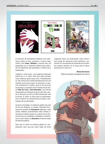 la formaci%u00f3n de estudiantes mediante unos seminarios donde se leen, comentan e incluso crean c%u00f3mics. Para Green, Williams y muchos m%u00e1s, las patograf%u00edas son un elemento perfecto para entender los elementos m%u00e1s personales e %u00edntimos de la enfermedad.Llegados a este punto, una pregunta pertinente podr%u00eda ser si un c%u00f3mic tiene que estar pensado como medicina gr%u00e1fica para serlo. Probablemente no. Hay c%u00f3mics que s%u00ed est%u00e1n pensados para ser una reflexi%u00f3n acerca de la salud, su ausencia o la relaci%u00f3n asistencial. En cambio, otros lo son de forma involuntaria. Un ejemplo ser%u00eda El tiempo de los tres, de Fidel De Tovar y Dani Berm%u00fadez, una historia ambientada en la Barcelona de los a%u00f1os 80 y donde la infecci%u00f3n por VIH y el SIDA sobrevuelan toda la ficci%u00f3n. El c%u00f3mic no trata sobre la enfermedad, pero s%u00ed explora las consecuencias sociales y personales de la enfermedad. Lecturas vinculadas a la medicina gr%u00e1fica hay m%u00e1s de las que imaginas. Lo puedes comprobar escuchando el podcast de Normaland dedicado a este campo. Adem%u00e1s, aprovechamos estas %u00faltimas l%u00edneas para invitarte a pensar en cu%u00e1ntos de los t%u00edtulos que vas a ver rese%u00f1ados, analizados y comentados en este n%u00famero de Descubre contienen trazas de medicina gr%u00e1fica. Decir que un c%u00f3mic es medicina gr%u00e1fica es, simplemente, decir que ese c%u00f3mic habla de forma sugerente sobre una enfermedad, sobre salud o que retrata las relaciones entre sanitarios y pacientes. Es una etiqueta de contenido que se a%u00f1ade al g%u00e9nero literario. Es un aviso para el lector: esta lectura te har%u00e1 vivir. M%u00f2nica Rex GarciaM%u00e9dica de familia y divulgadora de c%u00f3micsASTRONAVE %u2022 INVIERNO 2026 P%u00c1G. 26 //