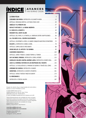 AVANCESINVIERNO 2026LA REINA P%u00c1LIDA ................................................................ 3CUIDANDO CON MIEDO. ENTREVISTA A ELISABETH KARIN ....................... 13ART%u00cdCULO. MEDICINA GR%u00c1FICA: LECTURAS PARA VIVIR ........................... 23ANG%u00c9LICA Y EL PR%u00cdNCIPE OSO ................................................... 27ROYALTY WITCHES 3. LA REINA IND%u00d3MITA .................................... 37EL JUEGO DE LA MUERTE 1 ..................................................... 40RESIDENT EVIL: DEATH ISLAND.................................................. 49ART%u00cdCULO. DEL PAPEL A LA PANTALLA: SINERGIAS ENTRE ADAPTACIONES........ 59ALL YOU NEED IS KILL. EDICI%u00d3N COLECCIONISTA.................................. 64ART%u00cdCULO. DE INTERNET AL PAPEL: EL DANMEI CONQUISTA NUESTRAS ESTANTER%u00cdAS .. 72ESCAPE 1. ENTREVISTA A DANIEL ACU%u00d1A......................................... 79ART%u00cdCULO. COMPLICADO ES M%u00c1S BONITO ......................................... 89ORSON WELLES. EL ARTISTA Y SU SOMBRA...................................... 93CAD%u00c1VERES EXQUISITOS 1 ..................................................... 103ART%u00cdCULO. JAMES TYNION IV: DANDO FORMA AL TERROR ....................... 113SOY UN %u00c1NGEL PERDIDO. ENTREVISTA A JORDI LAFEBRE ....................... 115SHERLOCK HOLMES CONTRA ARS%u00c8NE LUPIN. ENTREVISTA A ROGER VIDAL..... 1251629 O LA HORRIBLE HISTORIA DE LOS N%u00c1UFRAGOS DEL YAKARTA ............. 135ART%u00cdCULO. LA EVOLUCI%u00d3N DE LA MARINA DE GUERRA A TRAV%u00c9S DEL C%u00d3MIC ..... 145APRENDIZ DE CUERVO. ENTREVISTA A DANIDE................................. 151SEM%u00c1FORO. ENTREVISTA A VICENTE CIFUENTES................................ 161ART%u00cdCULO. HEROIC FANTASY MADE IN EUROPE .................................. 173EL MERCENARIO 1 ............................................................. 175ENTREVISTA A TERESA VALERO ................................................ 187Imagen de cubierta: Soy un %u00e1ngel perdido de Jordi Lafebre.Edici%u00f3n no venal. Prohibida su venta.%u00a9 2026 NORMA Editorial S.A. NORMA Editorial, S.A. Pg. St. Joan 7, Pral. 08010 Barcelona.Tel.: 93 303 68 20. E-mail: norma@normaeditorial.com. Impreso en la UE.Textos de presentaci%u00f3n de novedades de c%u00f3mic europeo, americano, producci%u00f3n propia y Astronave: Jorge Garc%u00edaTexto de presentaci%u00f3n de El mercenario: Vicente SegrellesTextos de presentaci%u00f3n de novedades de manga: Miguel G%u00f3mez-CabreroDise%u00f1o y maquetaci%u00f3n: Joan Morenowww.NormaEditorial.comwww.NormaEditorial.com/noticiasFacebook: NormaEditorialX: @NormaEditorialInstagram: norma_editorial