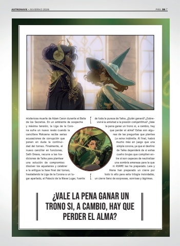 misteriosa muerte de Adam Caron durante el Baile de los Secretos. En un ambiente de sospecha y m%u00e1xima tensi%u00f3n, la Liga de la Corona sufre un nuevo rev%u00e9s cuando la cancillera Mokoena recibe serias acusaciones de corrupci%u00f3n que ponen en duda la continuidad del torneo. Finalmente, el nuevo canciller en funciones, Seth Emara, recurre a las tradiciones de Taika para plantear una soluci%u00f3n de compromiso: disolver los aquelarres y celebrar a la antigua la fase final del torneo, trasladando la Liga de la Corona a un lugar apartado, el Palacio de la Nieve Lugar, fuente de toda la pureza de Taika. %u00bfQui%u00e9n ganar%u00e1? %u00bfSobrevivir%u00e1 la amistad a la presi%u00f3n competititva? %u00bfVale la pena ganar un trono si, a cambio, hay que perder el alma? Estas son algunas de las preguntas que planteaLa reina ind%u00f3mita. Al final, habr%u00e1 mucho m%u00e1s en juego que una simple corona, ya que el destino de Taika depender%u00e1 de si estas cuatro brujas que compiten entre s%u00ed son capaces de neutralizar una sombr%u00eda amenaza para la que ni ASAME las ha preparado. Laia y Alena han preparado un cierre por todo lo alto para esta trilog%u00eda inolvidable,un cierre lleno de sorpresas, sonrisas y l%u00e1grimas. %u00bfVALE LA PENA GANAR UN TRONO SI, A CAMBIO, HAY QUE PERDER EL ALMA?ASTRONAVE %u2022 INVIERNO 2026 P%u00c1G. 38 //