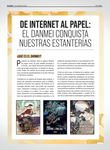 DE INTERNET AL PAPEL: EL DANMEI CONQUISTA NUESTRAS ESTANTER%u00cdAS%u00bfQu%u00e9 es el danmei?P udiendo ser definido como un g%u00e9nero literario de origen chino, en gran medida vinculado a la ficci%u00f3n, que relata relaciones homoer%u00f3ticas entre personajes masculinos, el danmei ha demostrado romper los moldes de su propia concepci%u00f3n para convertirse paulatinamente en mucho m%u00e1s que un fen%u00f3meno narrativo.Cultivado en su mayor%u00eda de mujeres para mujeres, o dentro de colectivos minoritarios como el LGTBIQ+, podemos encontrar los or%u00edgenes del t%u00e9rmino en el concepto japon%u00e9s tanbi, que podr%u00eda ser traducido como %u201cadoraci%u00f3n o entrega a la belleza%u201d y/o %u201cadicci%u00f3n a la belleza o a lo bello%u201d. En su origen, tanbi, hac%u00eda referencia a una sensibilidad est%u00e9tica vinculada a la apreciaci%u00f3n de la belleza masculina y a la exaltaci%u00f3n del ideal art%u00edstico; al ser adoptado en China, el vocablo evolucion%u00f3 hasta designar este tipo de narrativa centrada en las relaciones emocionales, afectivas e %u00edntimas entre hombres.Si bien es cierto que, al tratarse de un g%u00e9nero cuyas ra%u00edces se encuentran en comunidades nicho de Internet, resulta complicado establecer con precisi%u00f3n el momento en que se acu%u00f1%u00f3 propiamente el t%u00e9rmino, el danmei comenz%u00f3 a desvincularse de posibles denominaciones previas como yaoi o Boys%u2019 Love (BL) para configurarse como un g%u00e9nero con identidad y caracter%u00edsticas est%u00e9ticas, tem%u00e1ticas y de producci%u00f3n espec%u00edficas dentro del contexto cultural chino y, por ende, propias. Esta diferenciaci%u00f3n o cambio en el uso de la nomenclatura comenzar%u00eda a gestarse entre DANMEI %u2022 INVIERNO 2026 P%u00c1G. 72 //