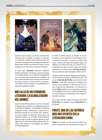aproxima m%u00e1s a la %u00e9pica y, por ende, los temas m%u00e1s tratados ser%u00e1n la lealtad, la justicia, el sacrificio y la redenci%u00f3n, donde el honor personal pesa m%u00e1s que la ley o el poder pol%u00edtico (aunque este elemento pueda estar tambi%u00e9n muy presente). Dentro de esta categor%u00eda encontrar%u00edamos por ejemplo Mil Oto%u00f1os.En tercer lugar, Xuanhuan (xu%u00e1nhu%u00e0n). Hablamos tambi%u00e9n de fantas%u00eda, sin embargo, a menudo ubicada con mundos alternos o en el presente, posiblemente con un entorno m%u00e1s occidentalizado o dist%u00f3pico; es decir, menos filos%u00f3fico que el xianxia, m%u00e1s enfocado en acci%u00f3n y aventura, la ciencia ficci%u00f3n y lo paranormal. Dentro de esta categor%u00eda encontrar%u00edamos por ejemplo El guardi%u00e1n de almas.M%u00e1s all%u00e1 de un fen%u00f3meno literario: La globalizaci%u00f3n del danmeiA partir del a%u00f1o 2000 podemos encontrar un estallido de popularidad, el danmei se ha globalizado gracias a plataformas digitales y comunidades en l%u00ednea que compart%u00edan fanfics, ilustraciones y traducciones a diferentes idiomas por los propios fans, generando casi sin saberlo un fen%u00f3meno transnacional. No obstante, Espa%u00f1a y la comunidad hispanohablante debieron esperar hasta la segunda d%u00e9cada de este siglo para ver surgir las primeras publicaciones oficiales, tanto impresas como digitales, que adaptaron t%u00edtulos populares. En 2022 el danmei aterriz%u00f3 en Espa%u00f1a en formato manhua con la llegada de El Gran Maestro de la Cultivaci%u00f3n Demon%u00edaca; la novela se public%u00f3 m%u00e1s tarde, en 2024; este mismo a%u00f1o tambi%u00e9n llegaron La Bendici%u00f3n del Oficial del Cielo y El Sistema de Autosalvaci%u00f3n del Villano Escoria. Estas tres novelas pertenecen a la misma autora, Mo Xiang Tong Xiu, toda una referente dentro del g%u00e9nero literario chino. Tambi%u00e9n en 2024 se uni%u00f3 al cat%u00e1logo de Norma Editorial la novela de El Husky y su Gato Blanco Shizu, de la autora Rou Bao Bu Chi Rou, m%u00e1s conocida como Meatbun. Y este 2025, ampliando el cat%u00e1logo de la autora, se han publicado La Mancha que nos queda y Compendio de Expedientes. Y sin descanso, la autora Priest tambi%u00e9n se ha incorporado al cat%u00e1logo con la llegada de tres de sus novelas m%u00e1s populares, Las tres estrellas de la Calamidad, Entre L%u00edneas y El Guardi%u00e1n de Almas.Para acabar este a%u00f1o, llegan dos nuevas autoras, Yi Shi Si Zhou con Peque%u00f1o Hongo y Meng Xi Shi con Mil Oto%u00f1os.Priest, una de las autoras m%u00e1s influyentes en la literatura chinaPriest es, sin duda, una de las autoras m%u00e1s influyentes y destacadas de este g%u00e9nero de ficci%u00f3n. Su DANMEI %u2022 INVIERNO 2026 P%u00c1G. 74 //