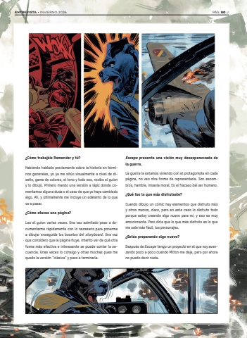 %u00bfC%u00f3mo trabaj%u00e1is Remender y t%u00fa?Habiendo hablado previamente sobre la historia en t%u00e9rminos generales, yo ya me sit%u00fao visualmente a nivel de dise%u00f1o, gama de colores, el tono y todo eso, recibo el guion y lo dibujo. Primero mando una versi%u00f3n a l%u00e1piz donde comentamos alguna duda o el caso de que yo haya cambiado algo. Ah, y %u00faltimamente me incluye un adelanto de lo que va a pasar.%u00bfC%u00f3mo atacas una p%u00e1gina?Leo el guion varias veces. Una vez asimilado paso a documentarme r%u00e1pidamente con lo necesario para ponerme a dibujar enseguida los bocetos del storyboard. Una vez que considero que la p%u00e1gina fluye, intento ver de qu%u00e9 otra forma m%u00e1s efectiva e interesante se puede contar la secuencia. Unas veces lo consigo y otras muchas pues me quedo la versi%u00f3n %u201ccl%u00e1sica%u201d y paso a terminarla.Escape presenta una visi%u00f3n muy desesperanzada de la guerra.La guerra la estamos viviendo con el protagonista en cada p%u00e1gina, no veo otra forma de representarla. Son escombros, hambre, miseria moral. Es el fracaso del ser humano.%u00bfQu%u00e9 fue lo que m%u00e1s disfrutaste?Cuando dibujo un c%u00f3mic hay elementos que disfruto m%u00e1s y otros menos, claro, pero en este caso lo disfruto todo porque estoy creando algo nuevo para m%u00ed, y eso es muy emocionante. Pero dir%u00eda que lo que m%u00e1s disfruto es lo que me sale m%u00e1s f%u00e1cil, los personajes.%u00bfEst%u00e1s preparando algo nuevo?Despu%u00e9s de Escape tengo un proyecto en el que voy avanzando poco a poco cuando Milton me deja, pero por ahora no puedo decir nada.ENTREVISTA %u2022 INVIERNO 2026 P%u00c1G. 80 //