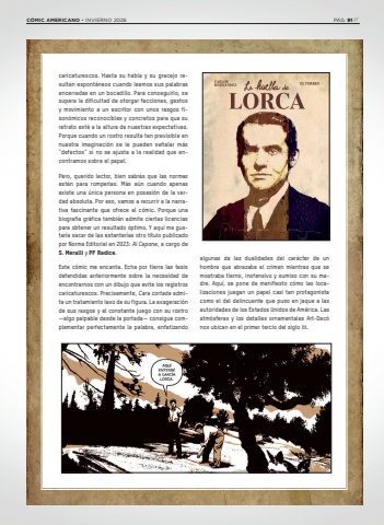 caricaturescos. Hasta su habla y su gracejo resultan espont%u00e1neos cuando leemos sus palabras encerradas en un bocadillo. Para conseguirlo, se supera la dificultad de otorgar facciones, gestos y movimiento a un escritor con unos rasgos fison%u00f3micos reconocibles y concretos para que su retrato est%u00e9 a la altura de nuestras expectativas. Porque cuando un rostro resulta tan previsible en nuestra imaginaci%u00f3n se le pueden se%u00f1alar m%u00e1s %u201cdefectos%u201d si no se ajusta a la realidad que encontramos sobre el papel.Pero, querido lector, bien sabr%u00e1s que las normas est%u00e1n para romperlas. M%u00e1s a%u00fan cuando apenas existe una %u00fanica persona en posesi%u00f3n de la verdad absoluta. Por eso, vamos a recurrir a la narrativa fascinante que ofrece el c%u00f3mic. Porque una biograf%u00eda gr%u00e1fica tambi%u00e9n admite ciertas licencias para obtener un resultado %u00f3ptimo. Y aqu%u00ed me gustar%u00eda sacar de las estanter%u00edas otro t%u00edtulo publicado por Norma Editorial en 2023: Al Capone, a cargo de S. Meralli y PF Radice.Este c%u00f3mic me encanta. Echa por tierra las tesis defendidas anteriormente sobre la necesidad de encontrarnos con un dibujo que evite los registros caricaturescos. Precisamente, Cara cortada admite un tratamiento laxo de su figura. La exageraci%u00f3n de sus rasgos y el constante juego con su rostro %u2014algo palpable desde la portada%u2014 consigue complementar perfectamente la palabra, enfatizando algunas de las dualidades del car%u00e1cter de un hombre que abrazaba el crimen mientras que se mostraba tierno, inofensivo y sumiso con su madre. Aqu%u00ed, se pone de manifiesto c%u00f3mo las localizaciones juegan un papel casi tan protagonista como el del delincuente que puso en jaque a las autoridades de los Estados Unidos de Am%u00e9rica. Las atm%u00f3sferas y los detalles ornamentales Art-Dec%u00f3 nos ubican en el primer tercio del siglo xx. C%u00d3MIC AMERICANO %u2022 INVIERNO 2026 P%u00c1G. 91 //