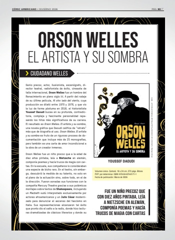 Genio precoz, actor, ilusionista, escen%u00f3grafo, director teatral, radiofonista de %u00e9xito, cineasta de talla internacional, Orson Welles fue un hombre del Renacimiento en pleno siglo xx. A partir del rodaje de su %u00faltima pel%u00edcula, Al otro lado del viento, cuya producci%u00f3n se dilat%u00f3 entre 1970 y 1976, y que vio la luz de forma p%u00f3stuma en 2018, el historietista Youssef Daoudi bucea en su profunda, contradictoria, compleja y fascinante personalidad repasando los hitos m%u00e1s significativos de su carrera. El resultado es Orson Welles. El artista y su sombra, una novela gr%u00e1fica que Daoudi califica de %u201cretrato%u201d m%u00e1s que de biograf%u00eda al uso. Orson Welles. El artista y su sombra es fruto de un riguroso proceso de documentaci%u00f3n que incluye m%u00e1s de 25 monograf%u00edas, pero tambi%u00e9n es una carta de amor incondicional a la obra de un creador inmenso.Orson Welles fue un ni%u00f1o precoz que a la edad de diez a%u00f1os pintaba, le%u00eda a Nietzsche en alem%u00e1n, compon%u00eda poemas y hac%u00eda trucos de magia con cartas. En la escuela, sus compa%u00f1eros lo consideraban una especie de bicho raro. En el teatro, sin embargo, descubri%u00f3 la medida de su talento, no solo en el plano de la actuaci%u00f3n sino, sobre todo, en el de la direcci%u00f3n. Fueron sonadas sus funciones con la compa%u00f1%u00eda Mercury Theatre gracias a sus pol%u00e9micos montajes sobre textos de Shakespeare, incluyendo un Macbeth vud%u00fa interpretado exclusivamente por actores afroamericanos y un Julio C%u00e9sar modernizado para denunciar el ascenso del fascismo en Italia. Sus representaciones alcanzaron tal %u00e9xito que pronto dio el salto a la radio, donde hizo lecturas dramatizadas de cl%u00e1sicos literarios y donde su ORSON WELLESEL ARTISTA Y SU SOMBRA%u203a CIUDADANO WELLESYOUSSEF DAOUDIOrson, Welles, l%u2019artiste et son ombre de Youssef Daoudi %u00a9 Editions Delcourt %u2013 2024.FUE UN NI%u00d1O PRECOZ QUE CON DIEZ A%u00d1OS PINTABA, LE%u00cdA A NIETZSCHE EN ALEM%u00c1N, COMPON%u00cdA POEMAS Y HAC%u00cdA TRUCOS DE MAGIA CON CARTASVolumen %u00fanico. Carton%u00e9. 18 x 24 cm. 272 p%u00e1gs. BitonoPVP: por determinar. ISBN: 978-84-679-8171-1Fecha de publicaci%u00f3n: Marzo de 2026C%u00d3MIC AMERICANO %u2022 INVIERNO 2026 P%u00c1G. 93 //