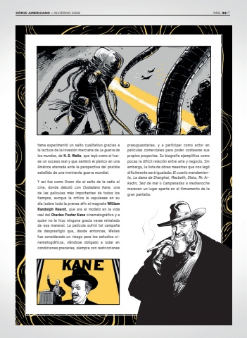 fama experiment%u00f3 un salto cualitativo gracias a la lectura de la invasi%u00f3n marciana de La guerra de los mundos, de H. G. Wells, que ley%u00f3 como si fuese un suceso real y que sembr%u00f3 el p%u00e1nico en una Am%u00e9rica aterrada ante la perspectiva del posible estallido de una inminente guerra mundial. Y as%u00ed fue como Orson dio el salto de la radio al cine, donde debut%u00f3 con Ciudadano Kane, una de las pel%u00edculas m%u00e1s importantes de todos los tiempos, aunque la cr%u00edtica la vapulease en su d%u00eda (sobre todo la prensa af%u00edn al magnate William Randolph Hearst, que era el modelo en la vida real del Charles Foster Kane cinematogr%u00e1fico y a quien no le hizo ninguna gracia verse retratado de esa manera). La pel%u00edcula sufri%u00f3 tal campa%u00f1a de desprestigio que, desde entonces, Welles fue considerado un riesgo para los estudios cinematogr%u00e1ficos, vi%u00e9ndose obligado a rodar en condiciones precarias, siempre con restricciones presupuestarias, y a participar como actor en pel%u00edculas comerciales para poder costearse sus propios proyectos. Su biograf%u00eda ejemplifica como pocas la dif%u00edcil relaci%u00f3n entre arte y negocio. Sin embargo, la lista de obras maestras que nos leg%u00f3 dif%u00edcilmente ser%u00e1 igualada: El cuarto mandamiento, La dama de Shanghai, Macbeth, Otelo, Mr. Arkadin, Sed de mal o Campanadas a medianochemerecen un lugar aparte en el firmamento de la gran pantalla.C%u00d3MIC AMERICANO %u2022 INVIERNO 2026 P%u00c1G. 94 //